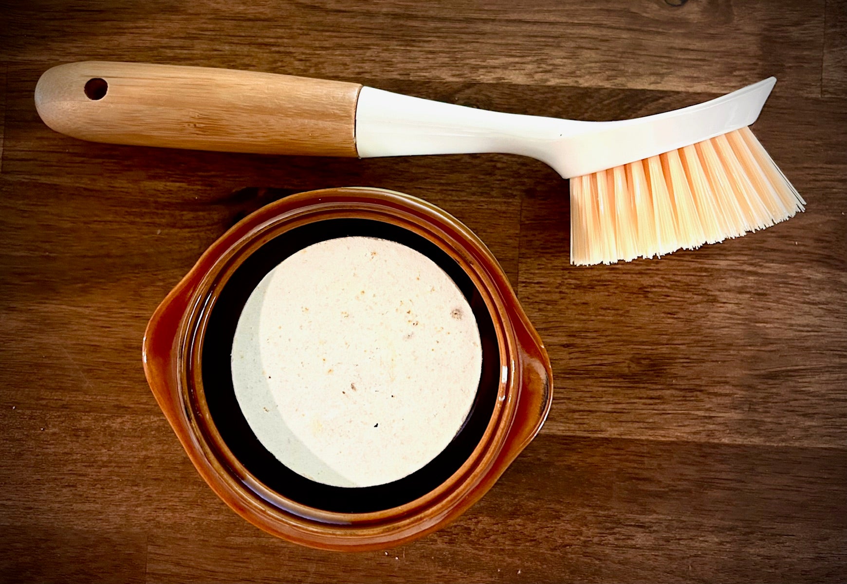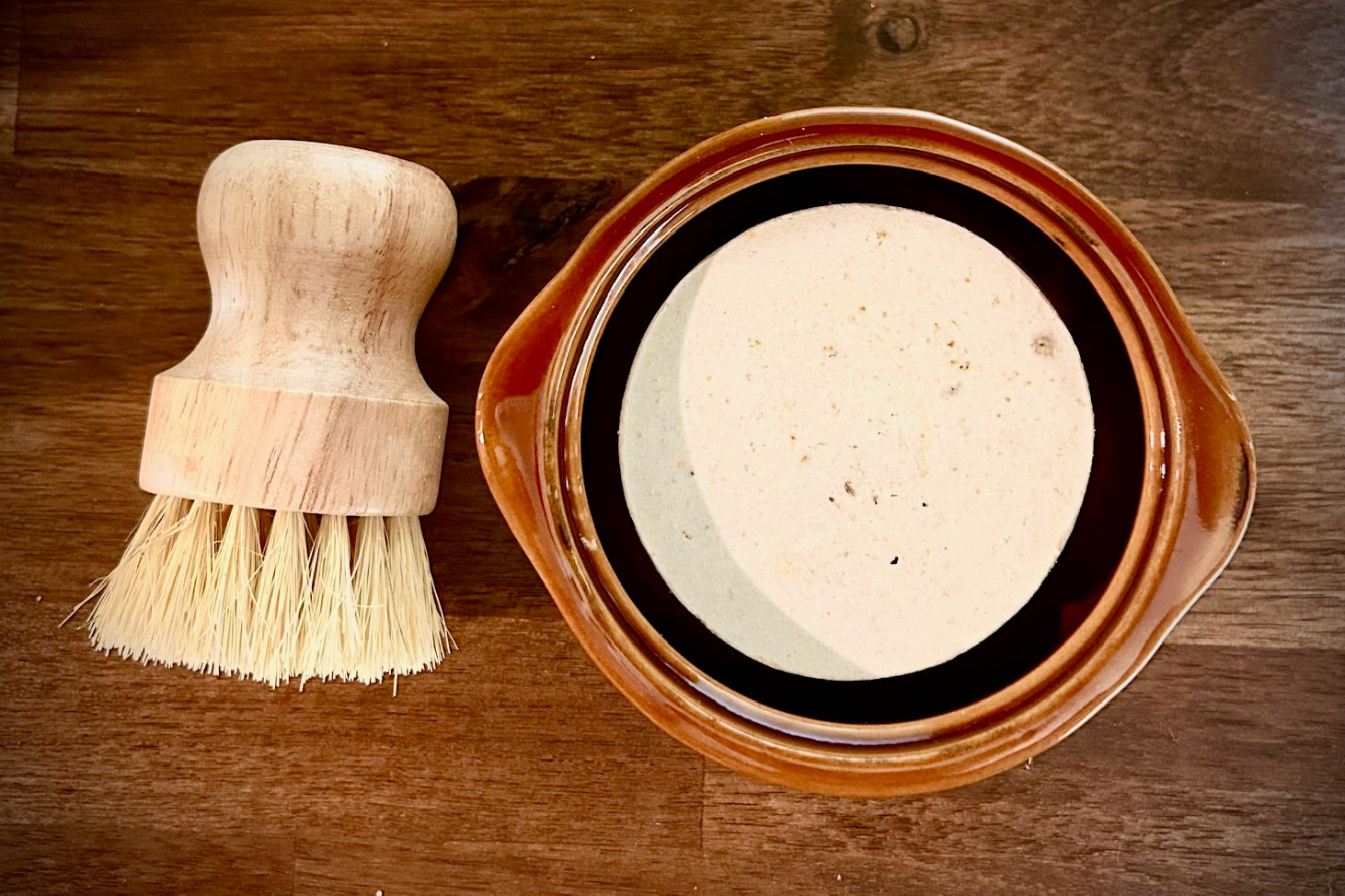 **How to Use:** Wet your chosen brush, swirl it on the soap bar to create a rich, bubbly lather, and scrub away. Rinse dishes clean – no residue, just sparkling results. When the bar runs low, simply refill with another from our collection. Once a day pour out any residual water in the bottom of the ramekin to make your bar last longer.